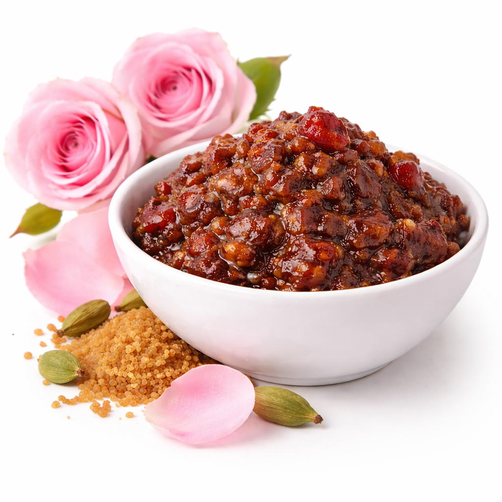 Made from fresh rose petals and natural sugar, this traditional gulkand is slow-prepared for rich taste and aroma. Perfect for cooling the body, improving digestion, and adding sweetness to milk, paan, and desserts.